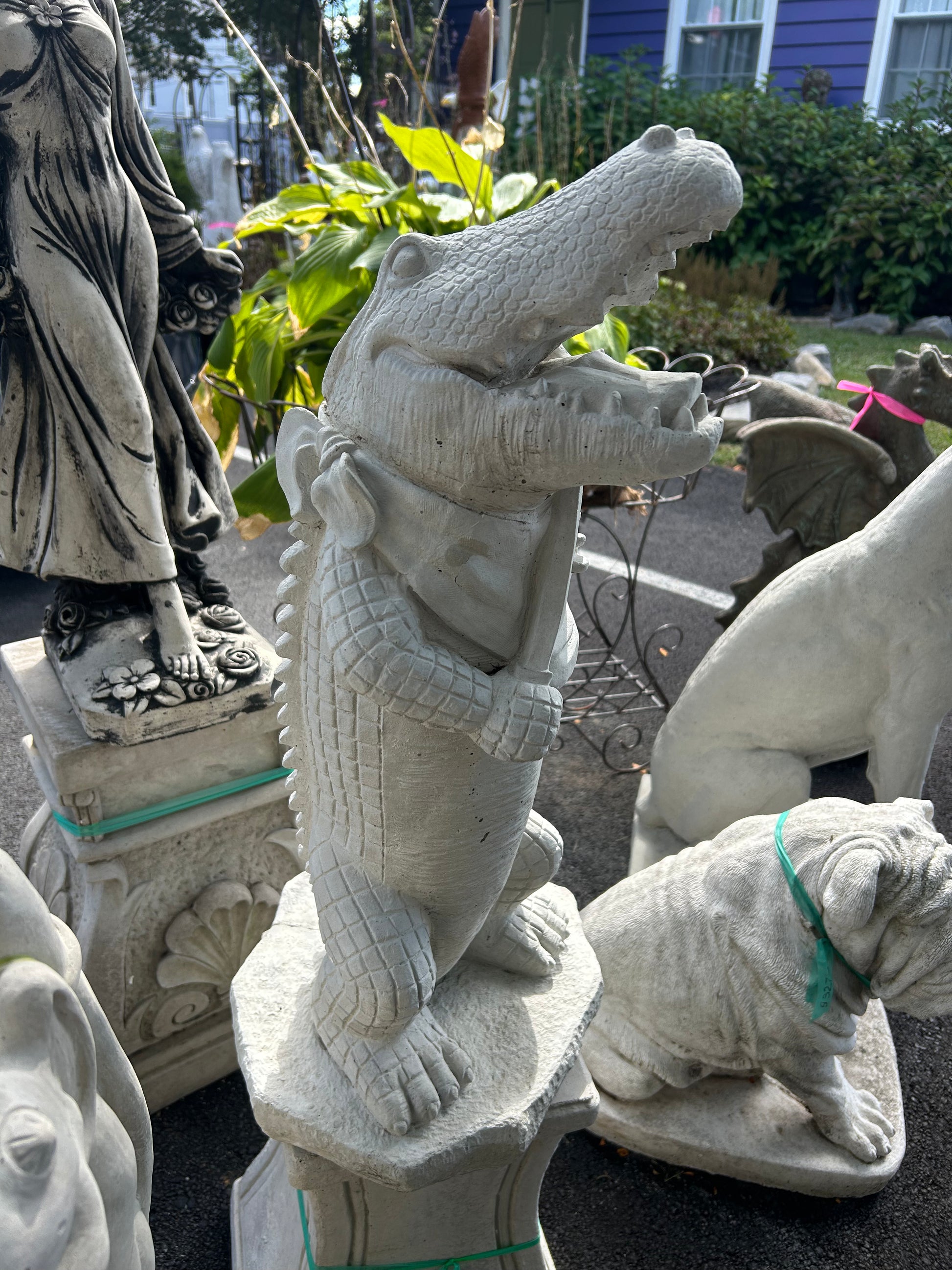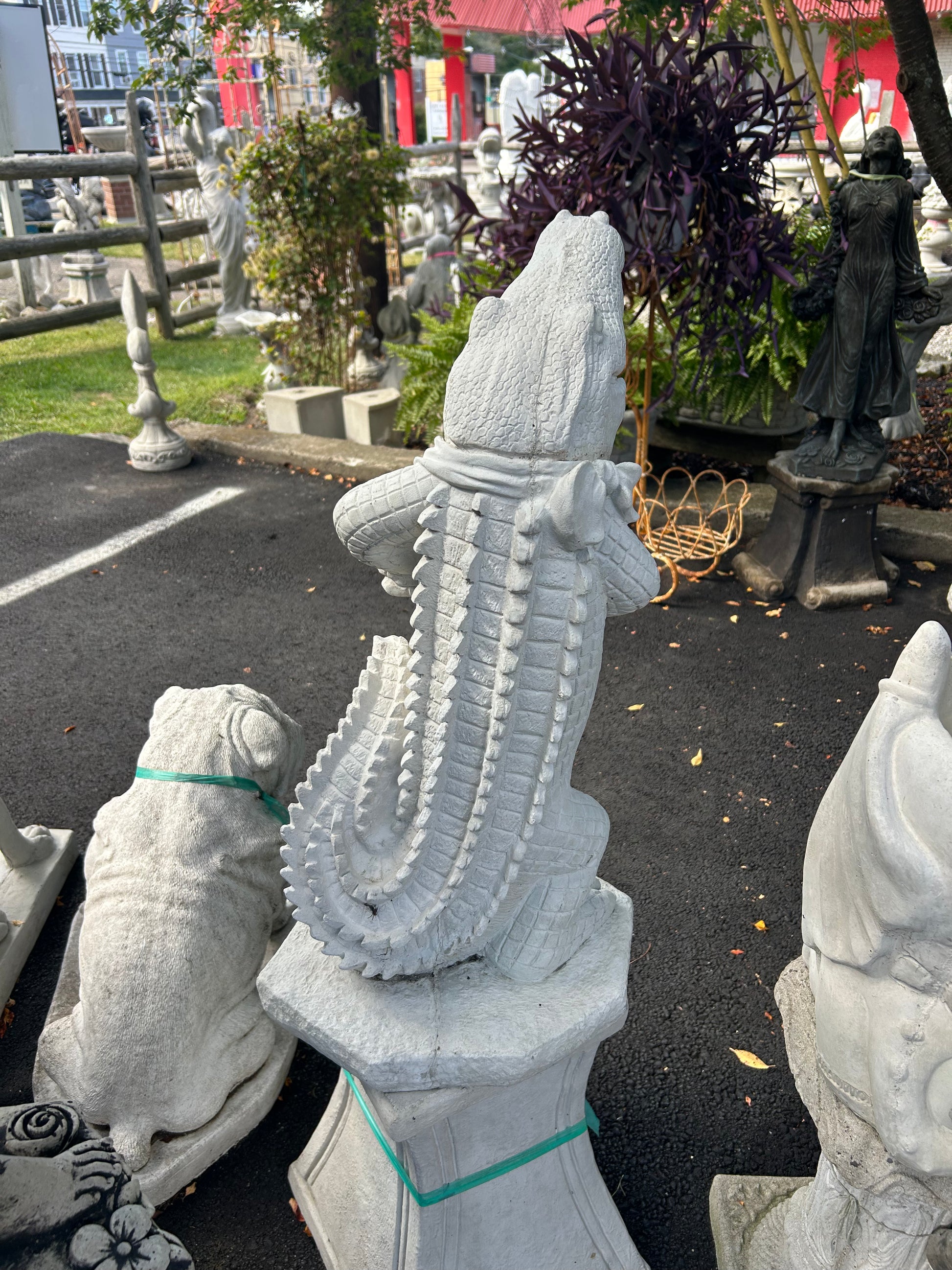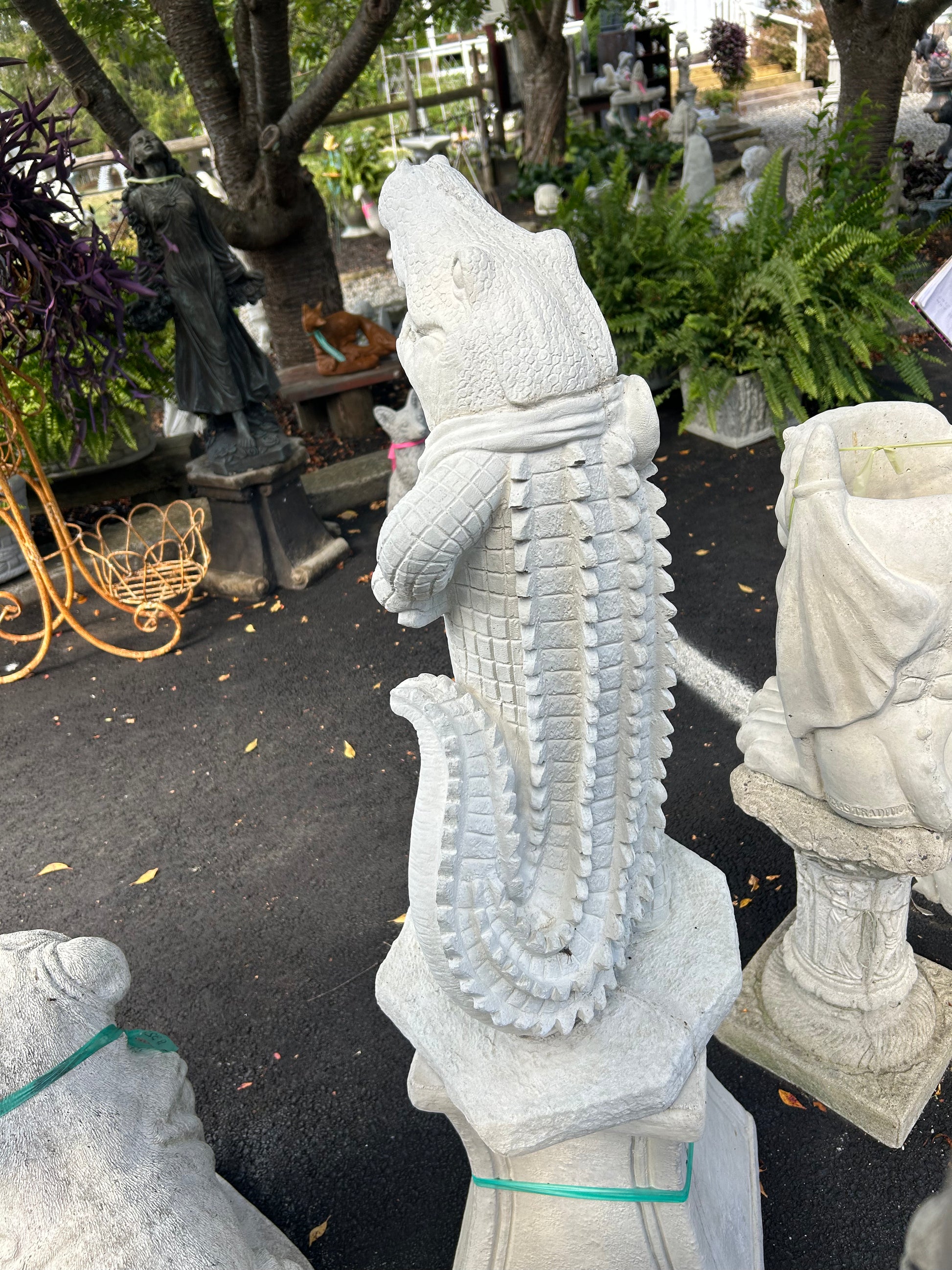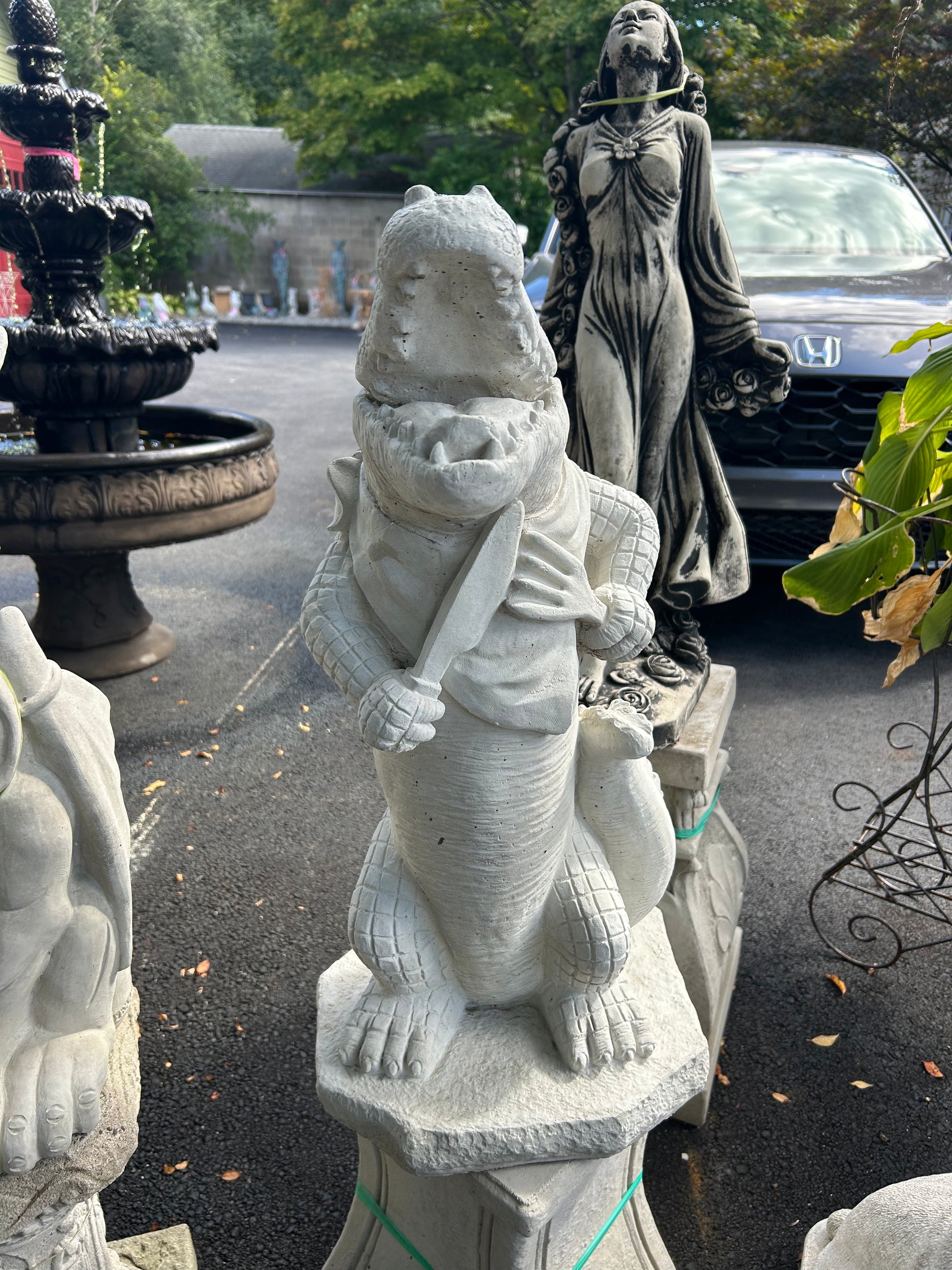 Concrete statue of a crocodile with his knife and fork ready for its next meal. Great for the garden.