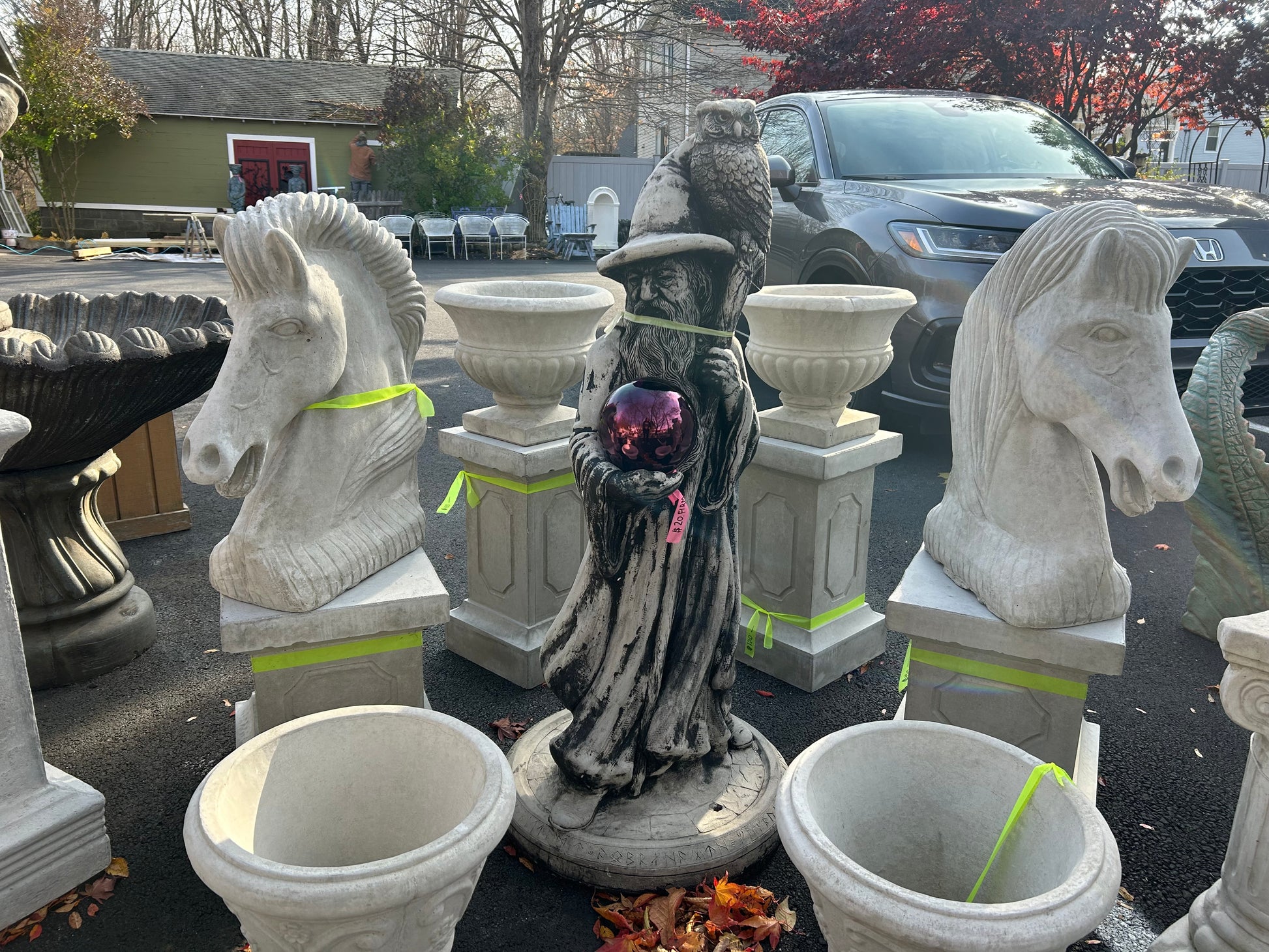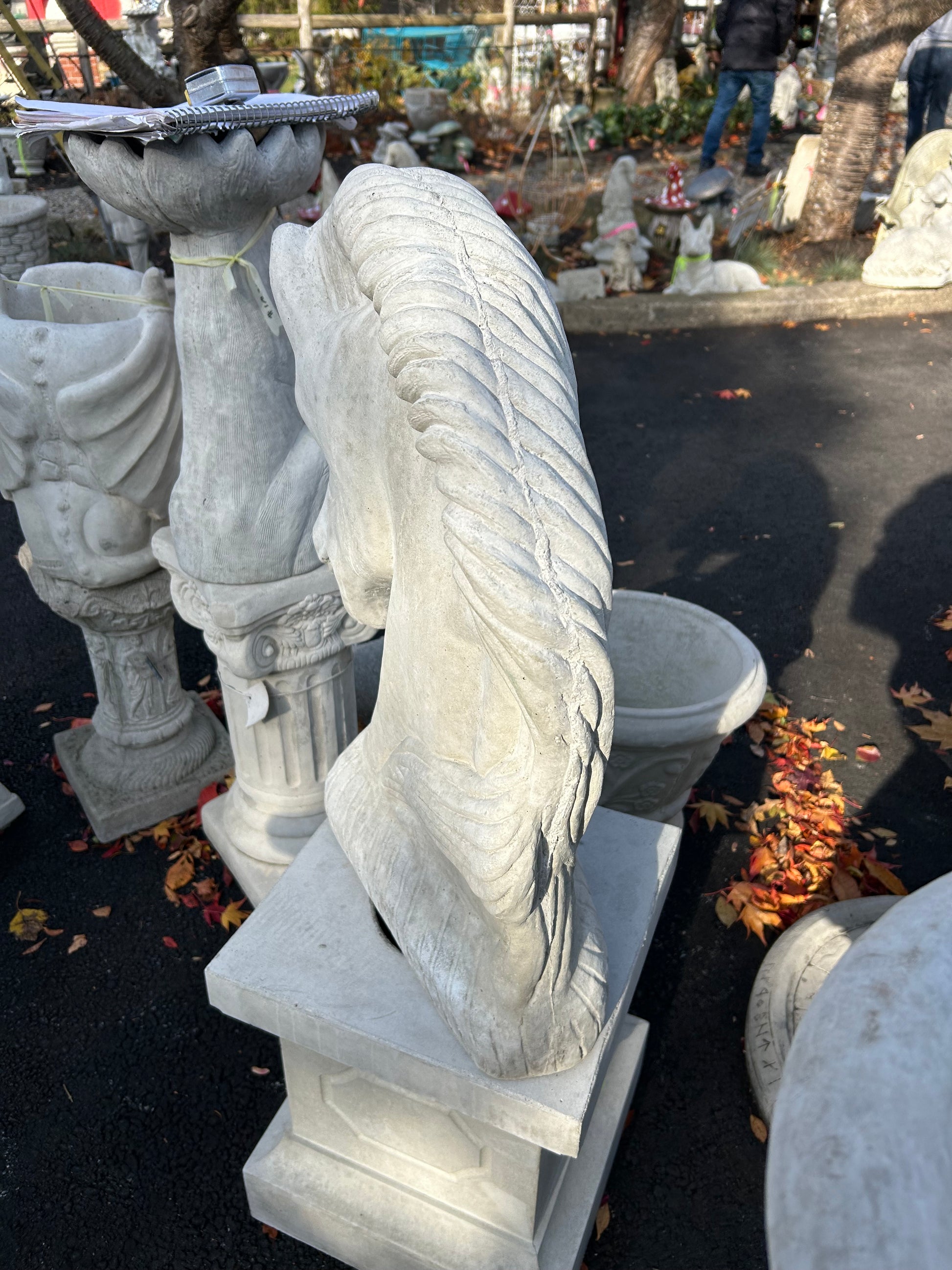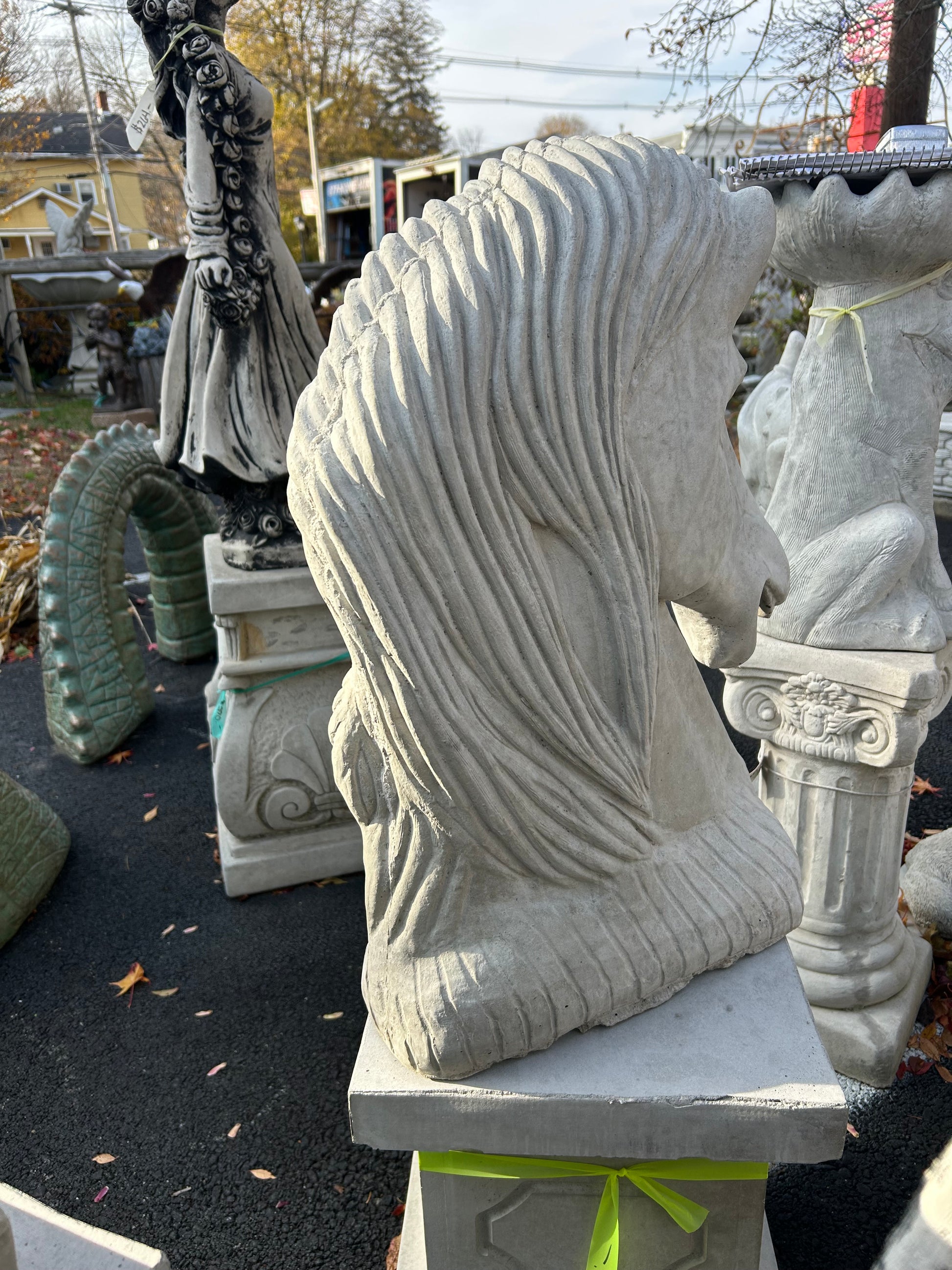 Concrete Statue of a Horse head. The perfect statue to put on top of columns at the end of the driveway, around the property, by the front door, or inside around the fireplace.