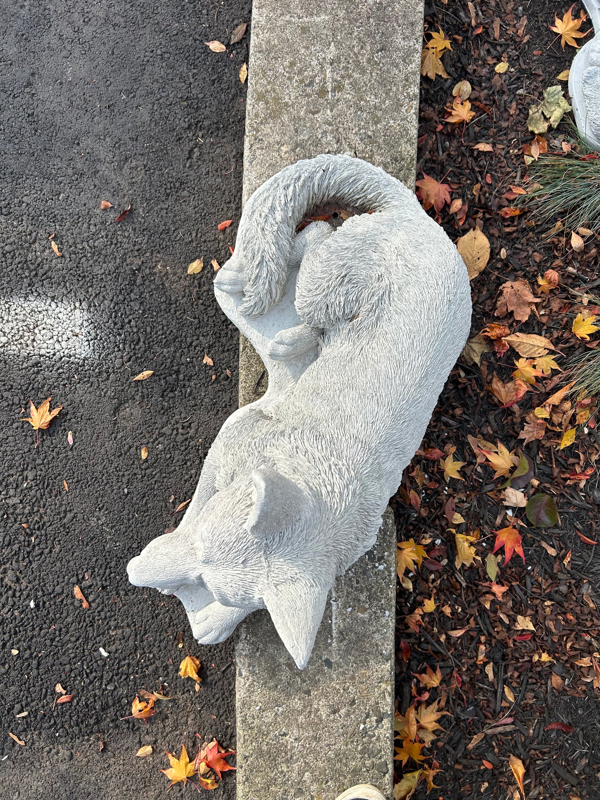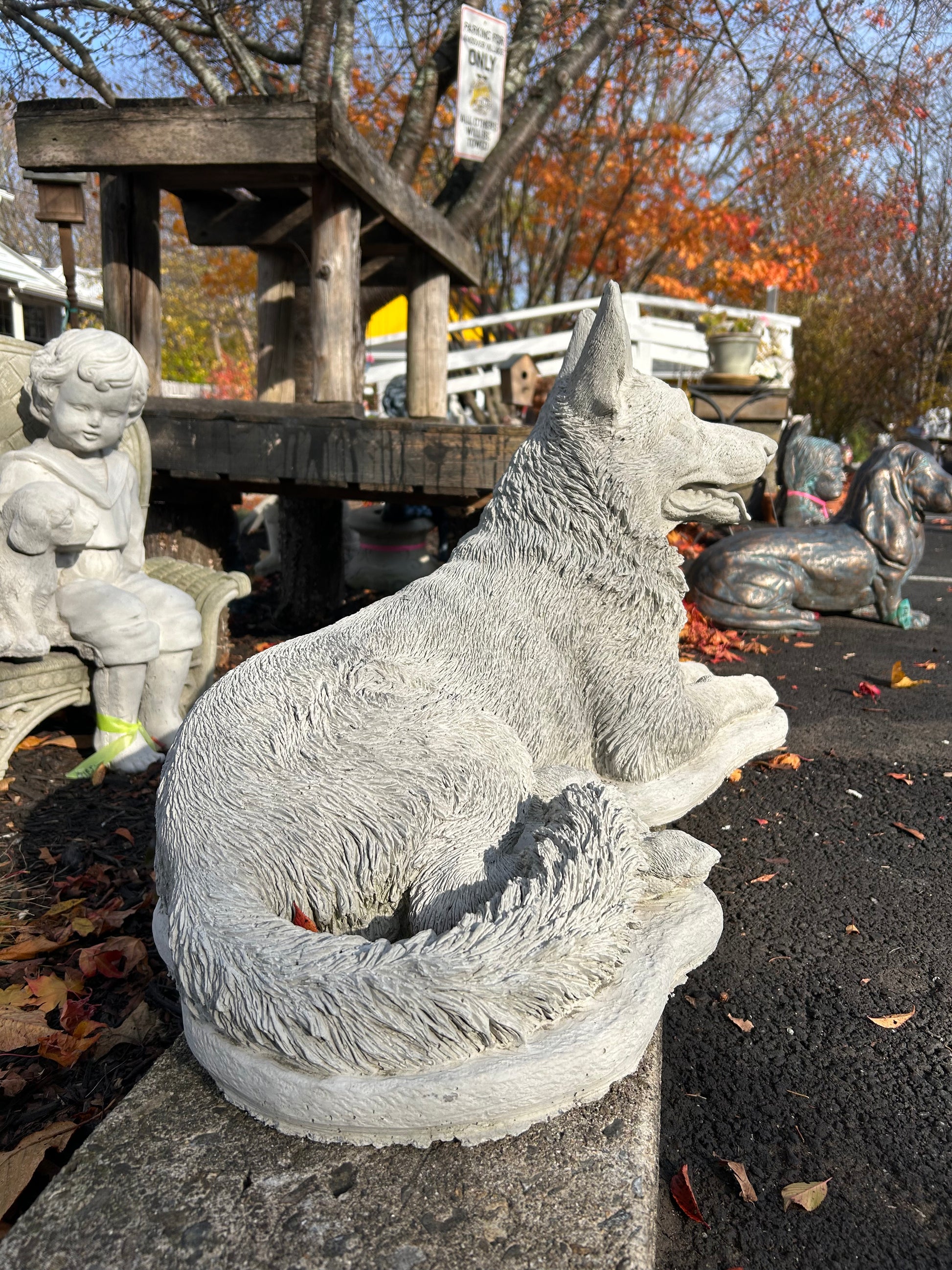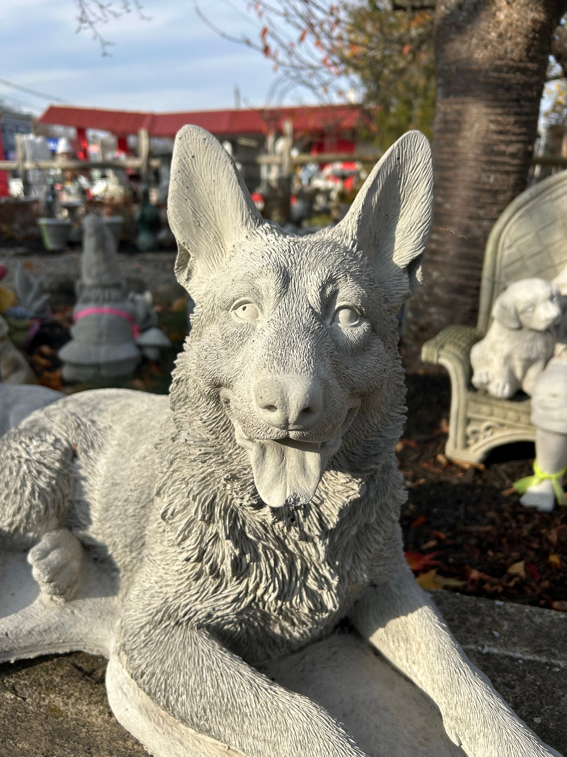Large German Shepard concrete statue that is in a lying position. Perfect for the garden or homes with German Shepard families.