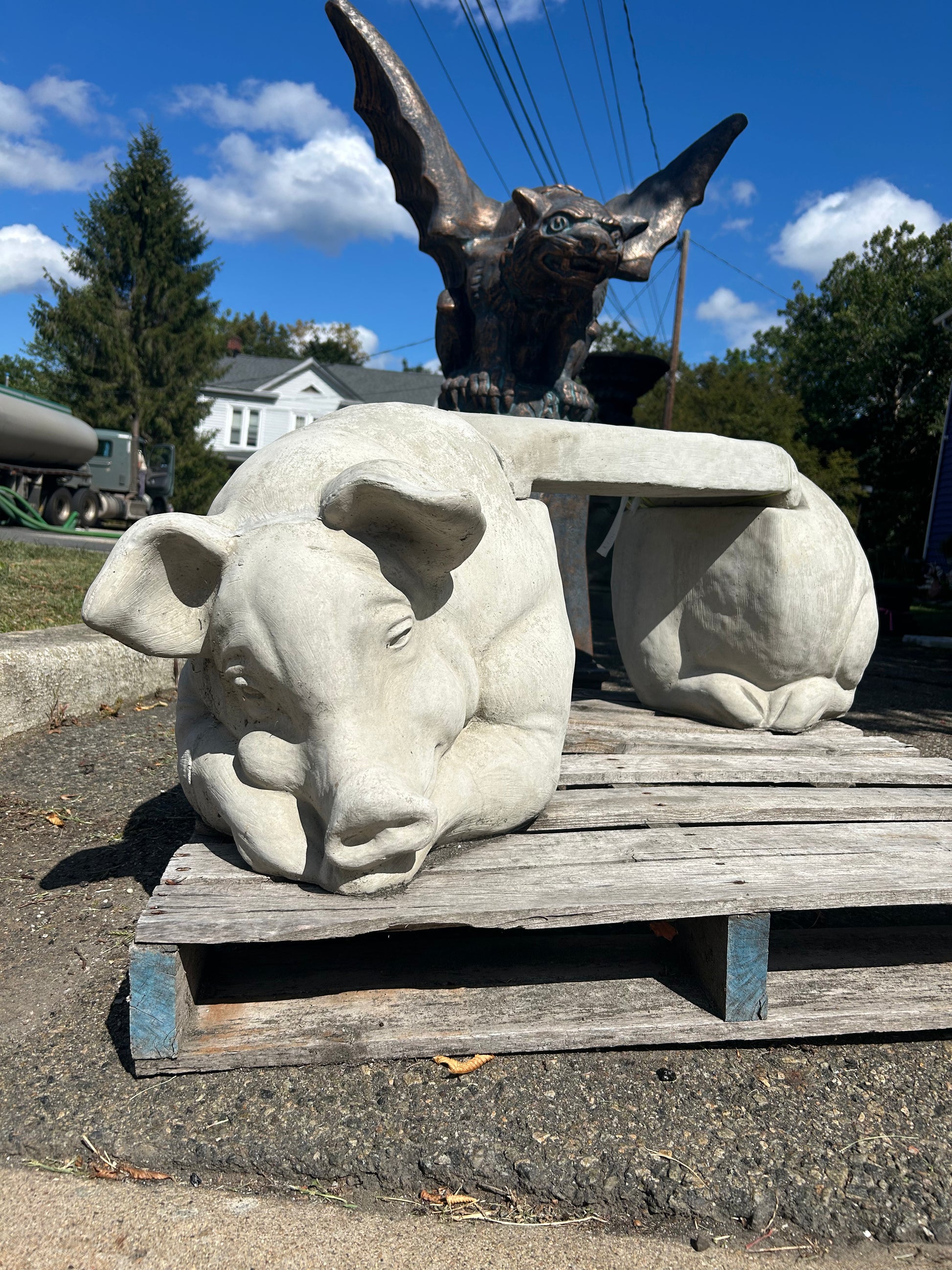 Large concrete pig bench that is perfect for by the barn, around the farmhouse, pig lovers, or in the garden.