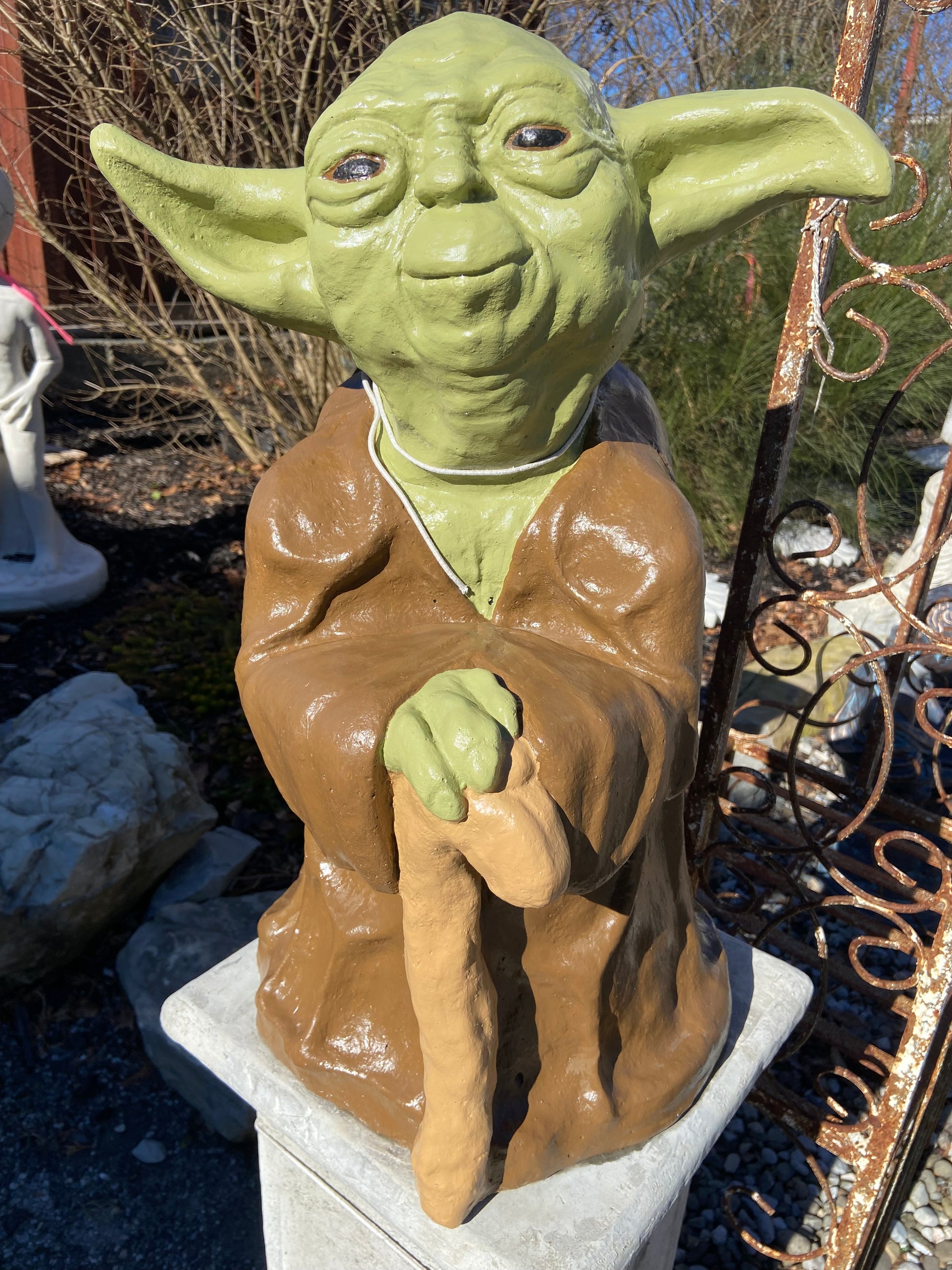 Invite the sage counsel of Yoda into your life with this captivating concrete statue. Meticulously sculpted to reflect the Jedi master's contemplative gaze and serene pose, this substantial 21" piece will command attention wherever you choose to display it - from the garden to the living room. Whether you're a die-hard Star Wars devotee or simply appreciate fine craftsmanship and unique home accents, this Yoda statue is a must-have addition that will elevate your space.